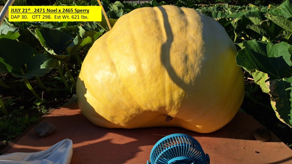 The 2471 Noel x 2465 Sperry (grown on a secondary vine) reached DAP 30 today. Its OTT = 298 and estimated wt. = 621 lbs.