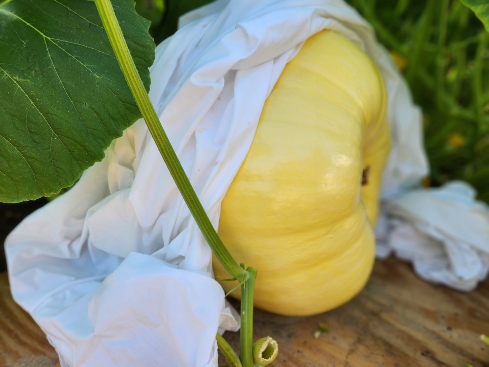 The pumpkin is 15 DAP in this photo. It's going to be hot tomorrow so I didn't completely unwrap and measure. Instead I put a fan on the blossom and stem and measurements will wait for another day. It's quite evident the pumpkin is growing well ahead of the rate of last year's efforts. My personal best weight is only 200#'s, so it's a 95% or more chance that this Vanhoutte seed is going to surpass that fairly soon...maybe even by the weekend.