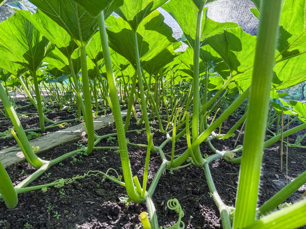 Under canopy view of the 2206. This plant is currently showing no signs of disease. Most vines have almost stopped growing at this point.