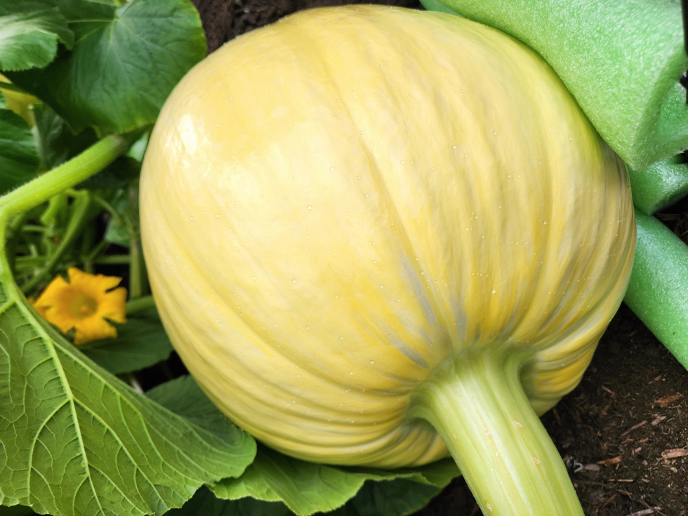This is a photo of the backup fruit on my 150 sf plant. I had planned to cut it off but my main fruit is beginning to get a case of the dimples, even though it's still gaining 15# a day on average for the past 5 days. This fruit is on a secondary vine. I didn't plan it to be the backup fruit, but it might became a necessity. To prepare for the inevitability I put a piece of 1 in insulation board under it and repositioned it further from the retaining board in the bed.
