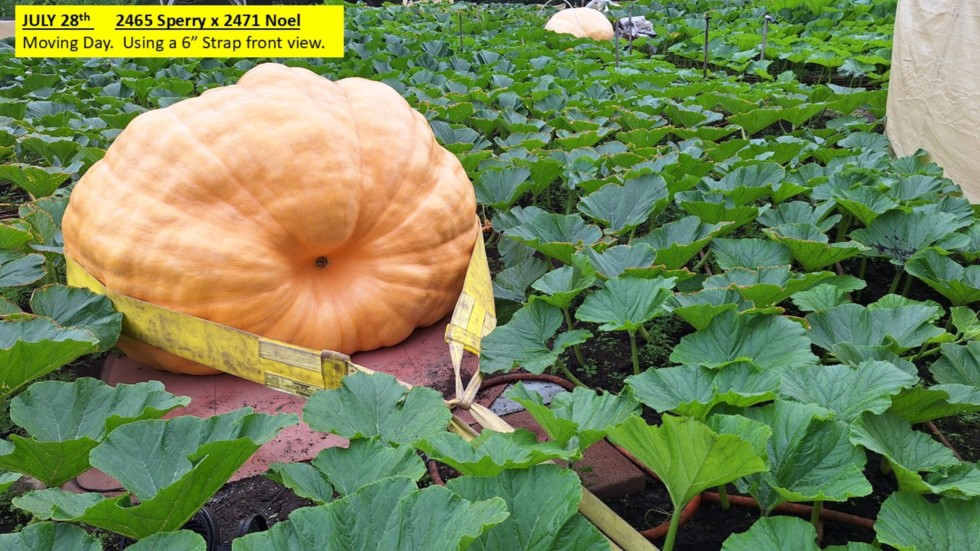 MOVING DAY. Had to move all 4 pumpkins today. Sometimes I pull the pink tarp with the 2 ton come-along. Today I decided to move the pumpkion with the 10 ft long x 6 inch wide strap. Lots of ways to move them to relieve vine stress.