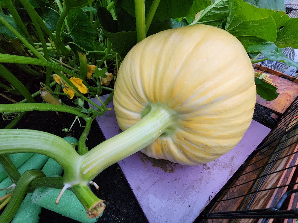 4" of rain, so today will be spent monitoring the fans I have strategically placed to dry things out as efficiently as possible. I also lost some leaves from the weight of the rain collecting for the past 18 hours and wearing down some of the older ones to the point of breakage. Thankfully, we had no wind. If we had, this would be an entirely different kind of post. Here's a photo of the backup pumpkin this morning. I was going to remove it but then I saw a post where someone lost their main pumpkin after cutting off the backup.