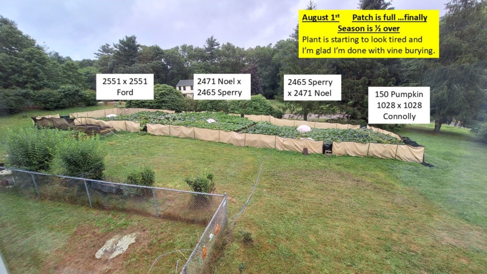 August 1st. Baby Bumps everywhere, and the old Connolly Patcharino is finally FULL. Now I can put my knee pads away since vine burying/training is done. We are 1/2 way to the finish line. Fingers crossed... ...the 150 pumpkin is hidden in the lower right of the photo, by the tan wind break fence.