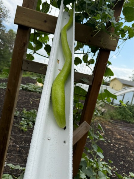 102 Crews long gourd. Starting to grow. +30�C helps.