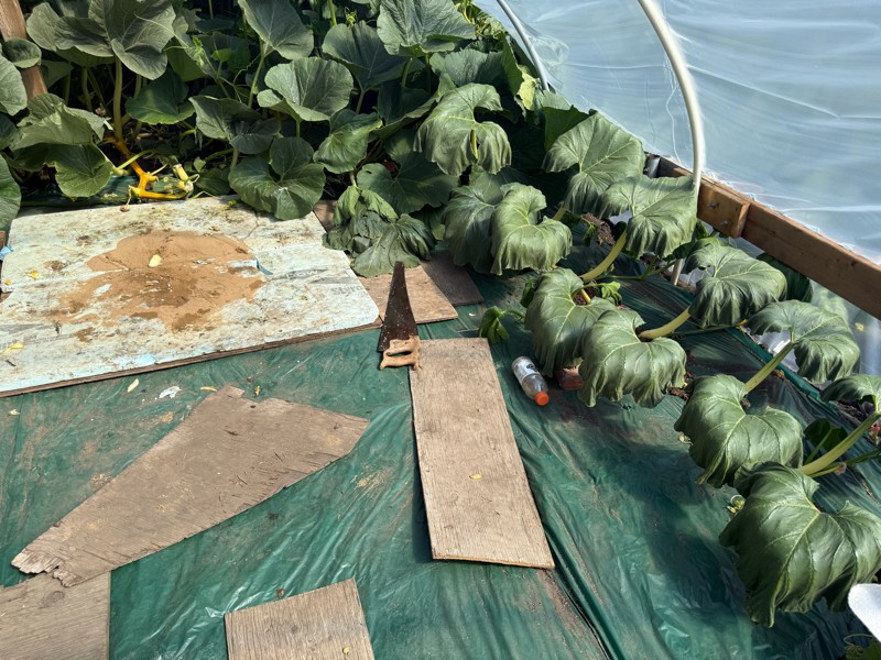 When cut from the vine, the secondary vines immediately before and any after the pumpkin died, even though they were rooting well. Looks like it takes a well developed vine to actually contribute to the growth of the pumpkin. I'd estimate it takes about 30 days for a contribution, unless it's really well watered. Which they weren't.