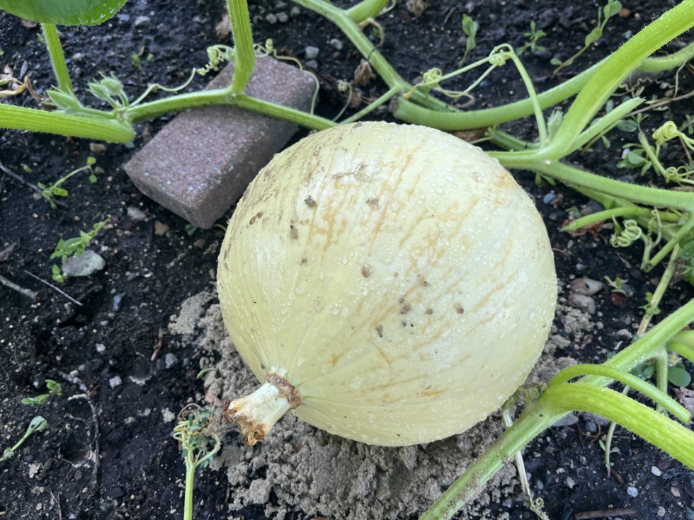 As we know, sometimes these plants surprise us. Despite being a larger, younger, and better looking plant, the pumpkin on the direct seeded plant was barely growing. I removed it yesterday.