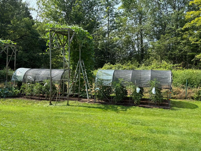 Preparing tomatoes and hoops for the mid to high 90 heat coming. Hopefully ward off early maturing.
