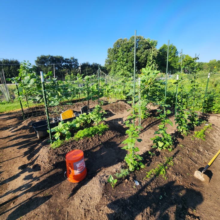 Second sweet potato planting starting their race up the poles. Verticle trellis set for watermelon. Spiral beets doing well.