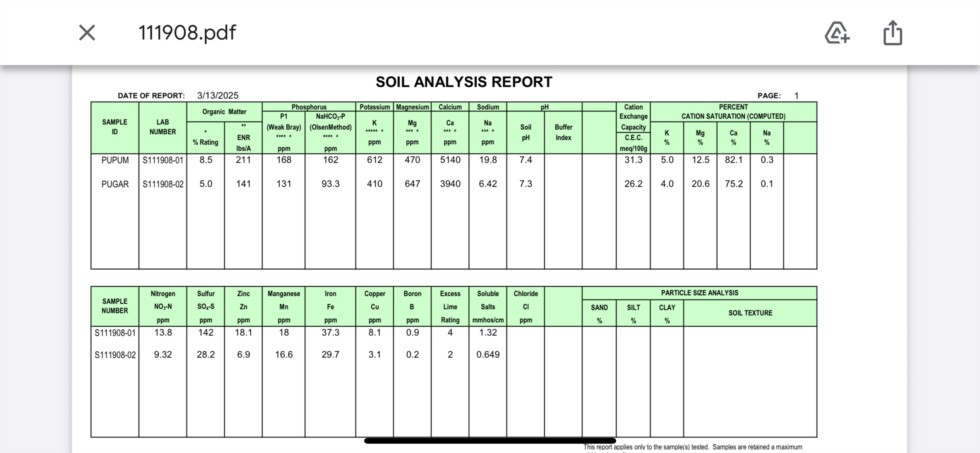 For comparison the top line in this sample is my spring soil test before adding amendments or tilling in the cover crop. To 3000 square feet I added 5 lb manganese sulfate, 3.5 lb fertibor, 10 lb 0-0-50, 30 lb feather meal, 13 lb iron sulfate, and 25 lb elemental sulfur. It's amazing how much lower the numbers are from last week's soil sample.