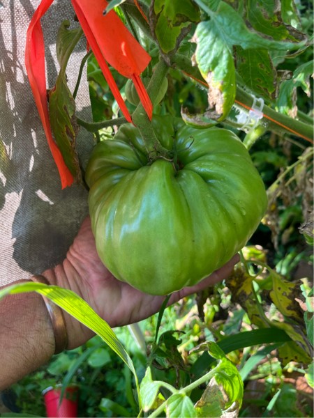 After the reminder from one of Team ScaMmer members that my maters needed a haircut they are looking a bit better and may be plumping up a bit. I have a hard time pruning down to one tomato but have done it on most of them. A couple I still have two on. This one is a good single on the famous Momate seed
