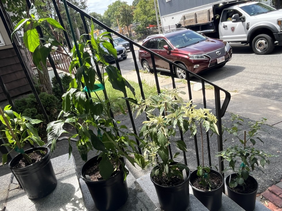 Hot pepper row. From the top down: F1 Ember Poblano Fish Impala Fish