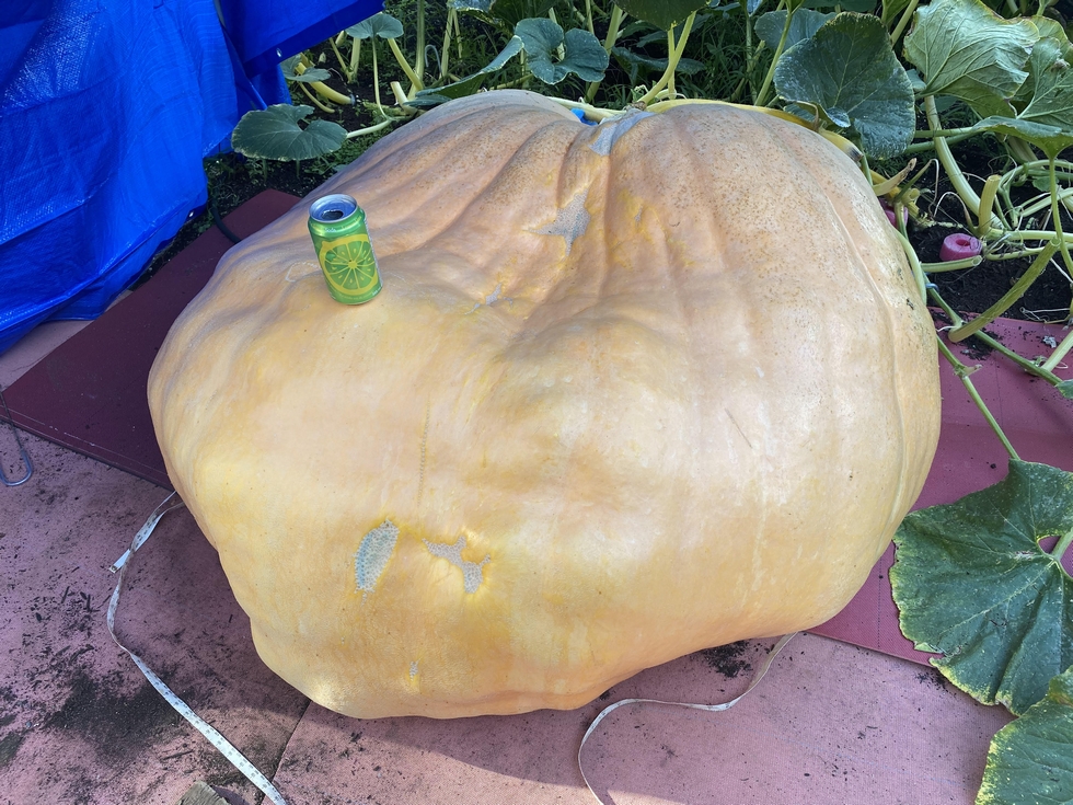 It's been a disappointing season. We started with some funky secondary vine issues and only the first pumpkin pollinated worked - all other backups aborted. "Gary" (as the pumpkin is now known) hasn't been packing on the pounds as it should have and is probably the ugliest one I've ever grown. It's lumpy and bumpy and flat. I doubt I'll make the early and expensive journey across the pond to get an official weight. My pumpkin lift supervisor will be out of country so it might just be a year where we pick Gary early and donate him to the local winery for their Pumpkin Fest. At least Gary has a natural "seat" for kids to sit in for pictures.