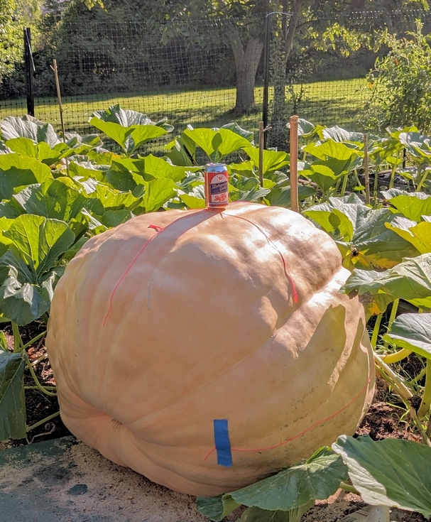 1526 Miller plant is starting to show age and wear-and-tear. Suddenly a lot of squash bugs of all ages + eggs, and scattered light powdery mildew. Trying to keep those from getting out of control with weekly Spectracide (Immunox+Permethrin). Pumpkin still looks decent and is adding 8-9 pounds a day averaged over 5 days (see growth chart, next diary entry). Measuring most days, but daily growth is often within the +/- 0.5" measurement error that I get.