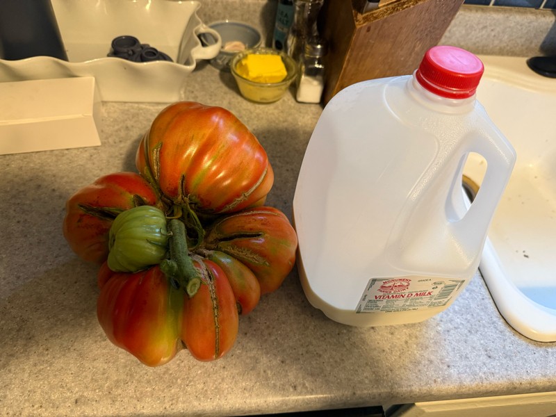 We had a fun time at the Woodstock Fair weigh off yesterday. It was run well with great people and a large potluck dinner! Our tomato weighed in at 5.49 pounds. Here it is with the obligatory gallon milk picture. Happy that we are harvesting a bit heavier each time one starts to ripen. Stay tuned for more.