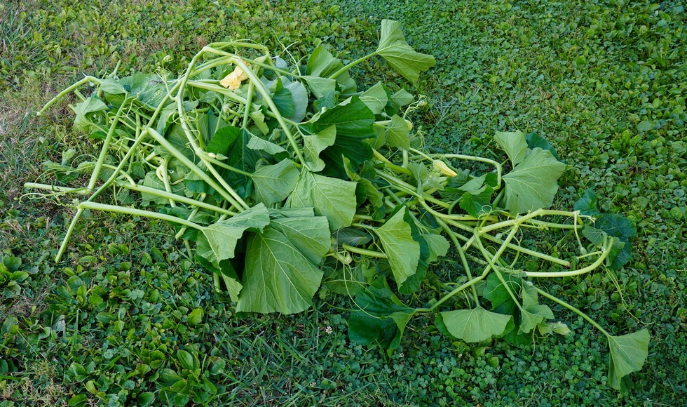 It seems that at this point in the season the weeds are actually tertiary vines. While the goal is to avoid walking through the plant as much as possible seeing the little "snake heads" of tertiary growth pop up here and here warrants going into the plant to remove them.