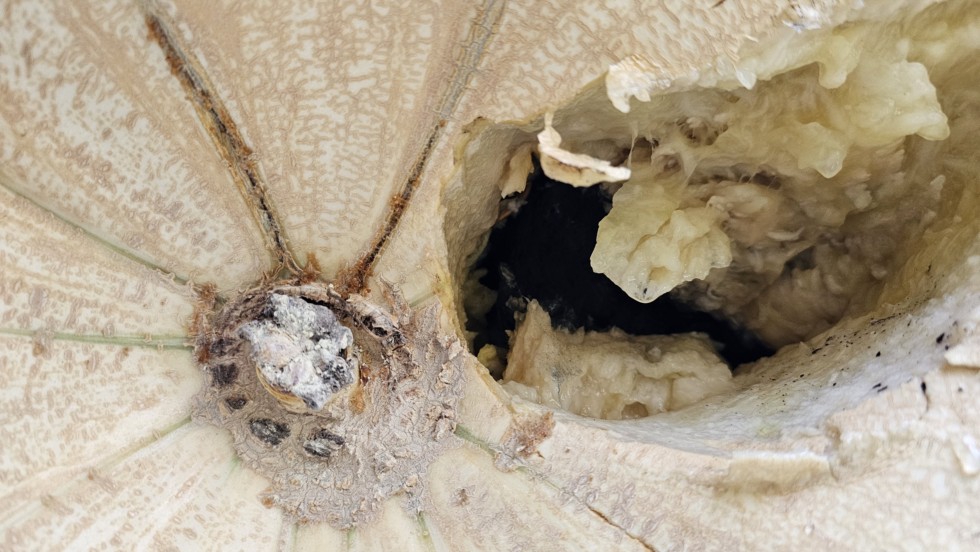 We're DONE !!! 2144 Barron #3 at 928 lbs showed a little black spot this morning. This what caused it? Rot from inside out?? We just passed 4300 for 3 pumpkins so our quest for a jacket for Janet is over.