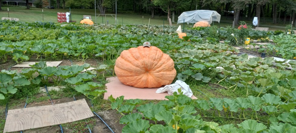 This is a fruit I have not shown yet. It's the 2369 Werner. It was an open pollination on the main vine that I ended up keeping because of issue getting another one pollinated. It never grew good at all because I was too wet earlier in the season, and nutrients were washed out and out of balance. It will likely end up around 900 #. I also set one on a side vine in the next pic. I used this plant to pollinate my 839 fruit. I think a 839 X 2369 will be a nice , BIG n orange cross.