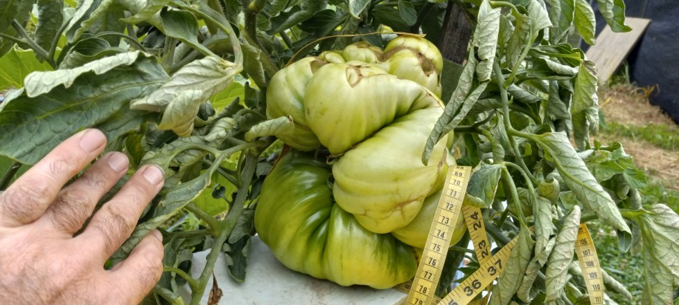 I have a few nice tomatoes growing for weighoffs. This is a 6.97 Foss. It's measuring at 26.5" circumference and seems to have slowed down. It's an 1/8" bigger than my pb of 6.13, but this one has a lot of air pockets, so I doubt it's that heavy.