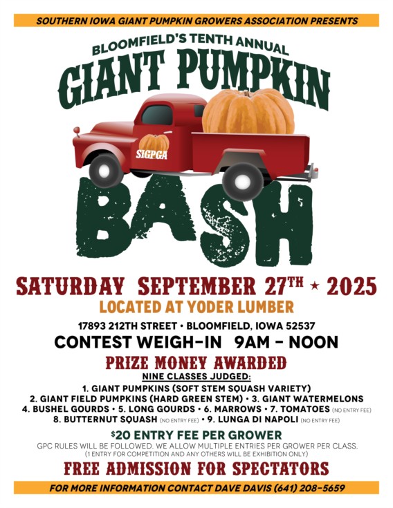 Bloomfield Giant Pumpkin Bash Sept. 27th. Weighing takes place 9am to noon. Awards and pumpkin drop following shortly thereafter. No alcohol event. Food and drink available. $20 entry fee per grower.