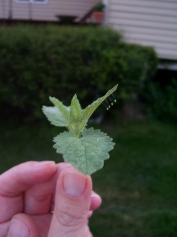 Small eggs hanging from strings off of a catnip plant.