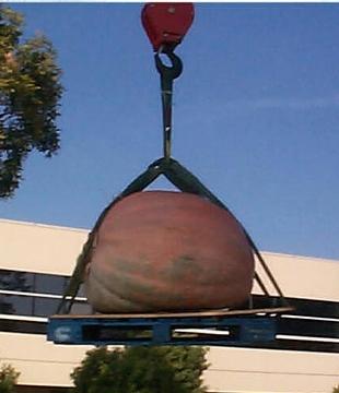 Picture of pumpkin being lifted out of the pickup and onto the display area for Halloween.