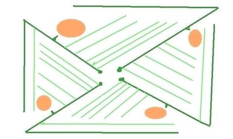 This is a picture of 4 plants grow flag style in a 34x34 sq , The darker green represents the main vine. Lighter green represents the secoundary vines. The first 3 secoundary vines should be grown as shown in drawing then cut every other secoundary off untill fruit. The first secoundary after the fruit should be grown in the direction as shown, Keep growning the main vine as shown setting small fruits on it then removing the fruits after they reach the size of softball. This keeps the plant thinking it is young. It is important to keep the main growing and to set the fruit on the side of the secoundry vines as shown in drawing, hope this helps Mark