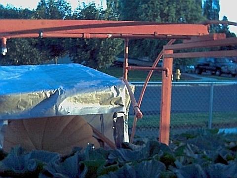 Here's a pic of my 644 it's a little hard to get it all in the photo! OTT today puts her at 275" or 429#. I think she will go heavy as I am trying that pulp mill belting stuff this year and she was 15% heavy last season. She gained 24.5 lbs per day over the last two days! No netting yet, and the stem/blossem end look great...