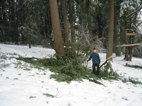 My brother and some of the branches that have fallen down. Not to mention a tree and another tree that is leaning torwards our house.