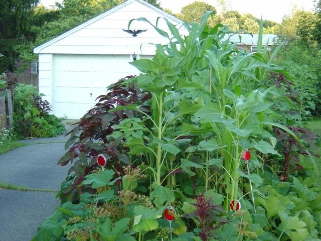 Mom's house in NY. 9 foot mexican june corn, various giant sunflowers, Bott's Strain, Craven, and self sown varieties, and various small variety marrows (for food). Damn red amaranth on left. (don't ever let it go to seed). Some mammoth dill plants on bottom left.