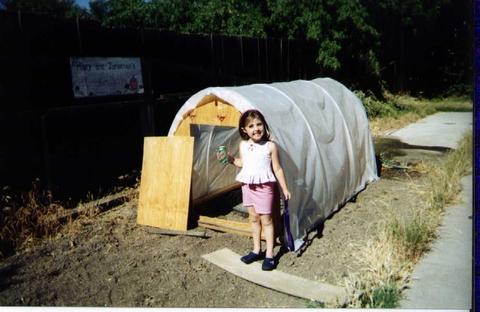 My daughter, Hilary standing with the hoop house/misting system we constructed. We hadn't put the hinges on for the door yet