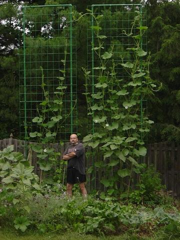 Also on the trellis, which you can see the leaves on both the right and left of me are giant scarlet runner beans (largest runner beans I've ever seen) that I got from giantveg.co.uk website. They were planted much later; so they aren't as big yet. They should make it to the top of the trellis. Directly behind me, which you can't see is a cucumber that I received from Bernard Lavery. The the parent cucumber was 15 lbs. I believe these large cucumbers are of the zeppelin variety. There are also some skyrocket tomatoes, but they are still not even a foot tall yet.