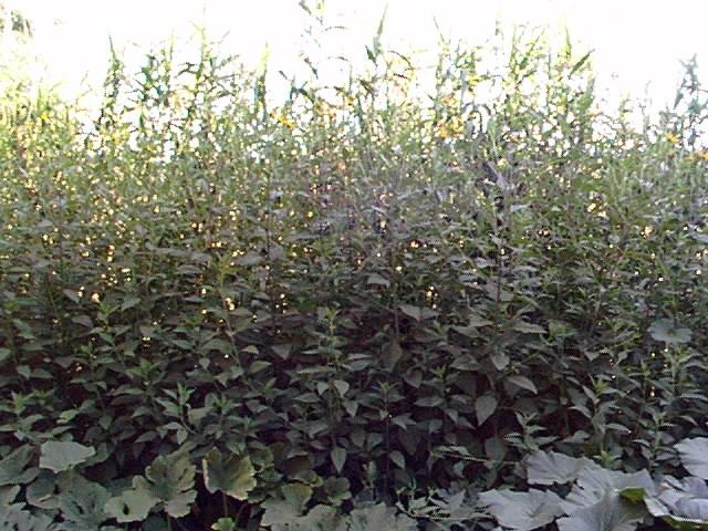 Sunchokes/jerusalem artichokes are just starting to flower. Behind them is bamboo.