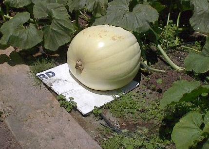 This is Harry on July 19, 2001 70 inches circumfrence, since then he has grown too 82 inches circumfrence. Harry is self pollinated as I thought I had an extra day before the flower would open. Came home and found the bees at work. Harry is from a 478 Kilbert 2000 seed