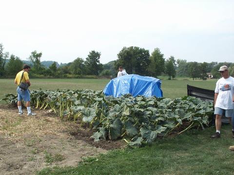 This is Joe's 805 plant. On the left is Bob standing next the stump of the 805. The plant is NOT that big, but the pumpkin became Joe's 1061!!