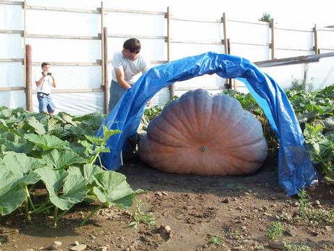 Alan's biggest pumpkin at the time of our visit was on his second 723 Bobier plant. It taped 352 OTT with a staggering 160 inch circumference. Estimated weight 873 pounds.