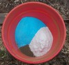 In the image this is my spreader that contains some kelp (brown/tan) in the bottom and then copper sulfate (blue) and manganese sulfate (white). I will hand mix all three of these together and then add in some more kelp which with be further mixed to ensure an even distribution before applying. This does save time and creates a consistent end product distribution.