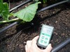 The white vertical PVC (polyvinyl chloride) pipes have Senninger Upright mini-Wobbler� outfitted with the #4 nozzle light blue (1/16�) which has a flow rate of 0.50 gpm (gallons per minute) and an approximate 32ft. diameter of coverage since I am running them at 20psi. These are intended to provide a cooling mist and not irrigate the plant. (Drip tapes are the intended irrigation source.) Adjustments were made over the course of the season, but a run time of 5min. every 15min. form 10am to 5pm was the starting base line.