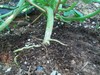 I tried to get a pic of the base of the stump on one of my plants. Notice the rough spot just above the roots. This spot is the portion of the stump that is below the soil when the seeding comes up. As soon as the cot leaves appear I remove the dirt down to the roots. (also helps prevent damping off) You have to support the plant with skewers. As the roots become more established I remove more soil until the roots are slightly exposed. The plant is on a mound so water can't pool after the dirt is removed. I feel this helps a lot with stump issues on melons because most often problems actually start at the base on the vine side you just don't notice it there until it has spread.