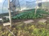 Raised walkway, need more cinder blocks, patch divided by 4 equal areas. 1 pumpkin plant and a watermelon in each section