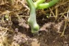 As the AG plants are treated already, but I wanted to take some pics of "before" and "after", I will do that treatment on one of my FP plants today, just to show the procedure. So that�s what it looks like before cosmetics. You know, parts A, B and C... A) hypocotyl (most of it buried in the ground in this case), B cotyledons (you can see only one, the other is hidden behind the vine, and you can see that a tiny secondary wants to emerge from the cotyledon node), C the first two secondaries (I will remove those secondaries and the leaves at those leaf nodes). So, before I take my small sharp knife to the plant, I dip the blade into the sulfur/ethanol dispersion to also disinfect the knife.