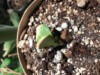 With this one the cots started to rot so I removed the seed coat, cut the rot off, and positioned it in an "already sprouted" position with its small root in the dirt. The cots were still totally white when I did this and had not separated. A mist of water a few times a day to keep the premature cots from drying out... & now it's looking well.
