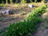 150 sq ft patch not quite ready. Four-leaf-clover layout... 3 or 4 plants will grow out from shared dirt & manure pile (to be created in the center at the location of the yellow bag). The short transit from where I will start the plants, one from each corner of the mound in the center, to the main patches, will be about three feet (an allotment of six square feet for this is seen roughly marked by the smaller boards). The main portion of each patch will each be 12x12 for the remaining 144 sq ft.
