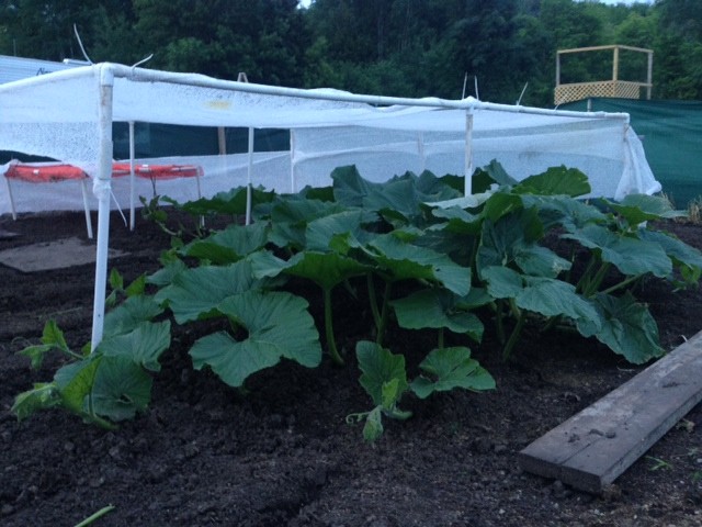 Plants have responded well to the dryer weather. We did get an inch of Rain on Friday but I can handle that amount. Most plants have a couple vines terminated now and have a pollination on them. Both Squash, 6 pumpkin and one Watermelon pollinated so far. I will get updated pictures tonight after the rest of the drip tape is layed and the shade structures are adjusted.