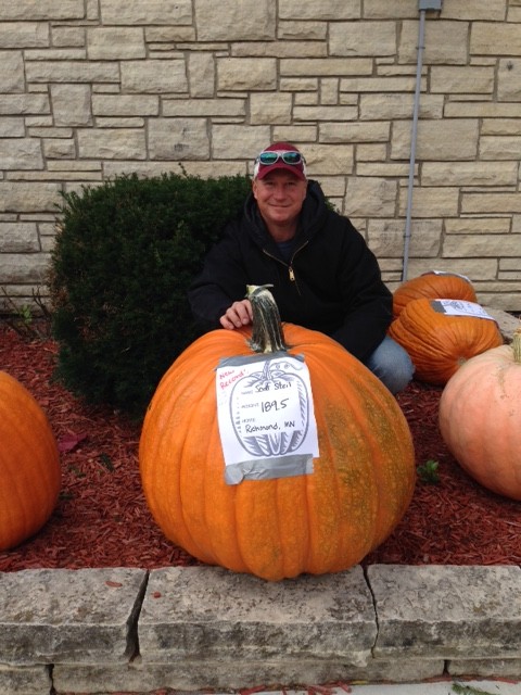 Here is your new MN State Record Field Pumpkin and a really happy grower. The 189.5 Steil 14 (81 Wolf x Self) weighed at Anamosa Iowa this weekend. This same 81 Wolf Plant grew the 141.5 (81 Wolf x Sibb) I weighed earlier this year and the 123 (81 Wolf x Self) Exhibition pumpkin I weighed this weekend. Two more left for Stillwater and then the patch will be empty.