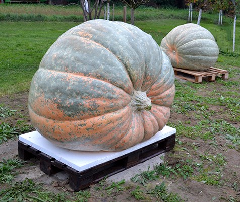 Two pumpkins, same plant. Of the 1783 Stevens. What a plant this was... 449 kg on main, 232 kg on secondary. See green, well.. say hello to mr. mosaic.. damn aphids.. If I had left just one pumpkin, and if it weren't mr. mosaic- what could have been, what could have been...