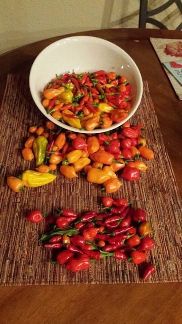 Here's today's harvest. Fatali, Habanero, Cayenne, Tabasco, Thai Dragon, Black Mamba, Red Caribbean, Ghost and Scorpion all had fruit to pick today. Fun to be still picking peppers in January!