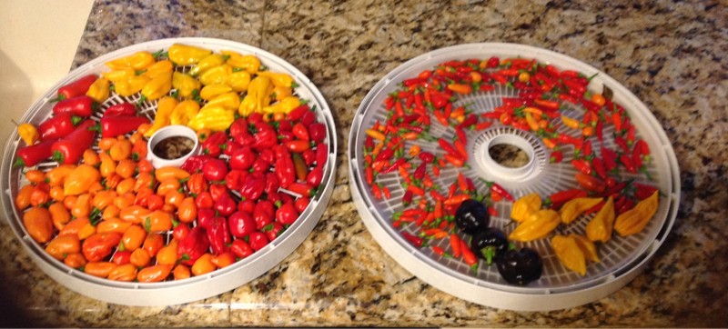 Fresh Peppers from the yard getting ready for the dehydrator. There's about 9 varieties in this batch - habenero, red carribean, fresno, scorpion, ghost, thai, cayenne, tabasco, fatali and a couple purple bell peppers.