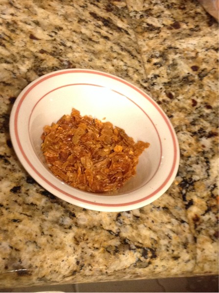 Step 1 - take some dried chilis - whatever kind you have/ like. Use 10-12 small peppers for a half cup of oil. I used 10 medium size fatali peppers and 2 scorpion chilis. While wearing GLOVES, break them up into flakes. Take out the stems. The recipe I have said to take out the seeds but I left them in, basically because its a PITA to take them out.