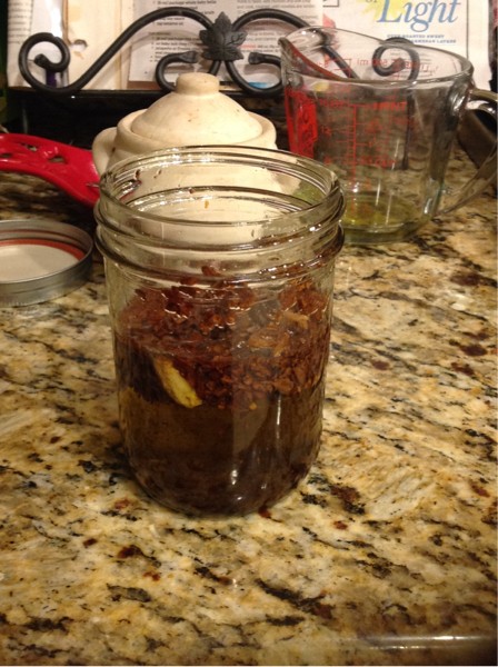 Step 4 - pour the hot oil over the chili flakes. You can see in this picture that I added a fresh clove of garlic to the jar before pouring the oil in. Why? Because garlic is good stuff that's why. And its good for you too.