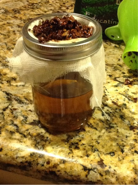 Here's a pic of the last stage of making chili oil. I took a piece of cheesecloth and laid it loosely over the top of a mason jar. Then a good idea hit me: rather than trying to awkwardly hold it in place, I screwed the ring back on. It held the cloth in place nicely while I poured the oil in. None of the pepper flakes got through at all. Next stop is the refrigerator and it will save here for a couple months.